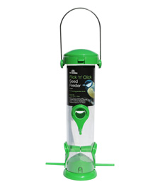 Code: CS043 Qty: 6 Flick ‘n’ Click 4 port Seed Feeder Flick top lid, flicks back to enable easy filling Clicks shut easily Strong perspex tube Holds all types of seed blends Trade orders or enquiries Call: 01405 766856 Email: sales@tomchambers.co.uk