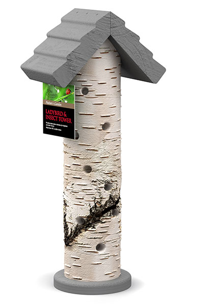 Code: Qty: Ladybird and Insect Tower Rustic birch log adds a natural touch to the product Soft grey roof and base Provides hibernation chambers for ladybirds and other insects benefical to gardens Trade orders or enquiries Call: 01405 766856 Email: sales@tomchambers.co.uk
